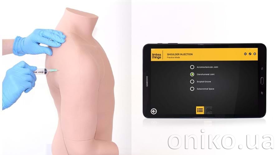 This palpation guided shoulder injection trainer comes with an Android Tablet and a preinstalled app for use during training.
