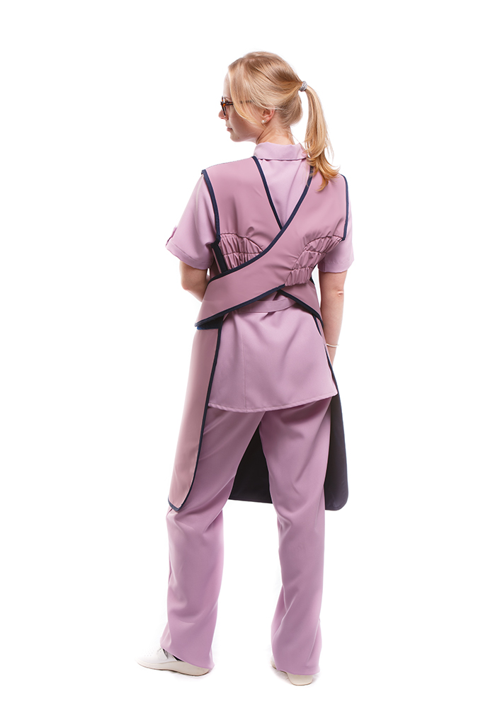 Фартук предназначен для защиты передней части туловища и боков от шеи до голеней, включая колени. Ширина передней панели фартука составляет 60% полного охвата изделия в каждом размере.